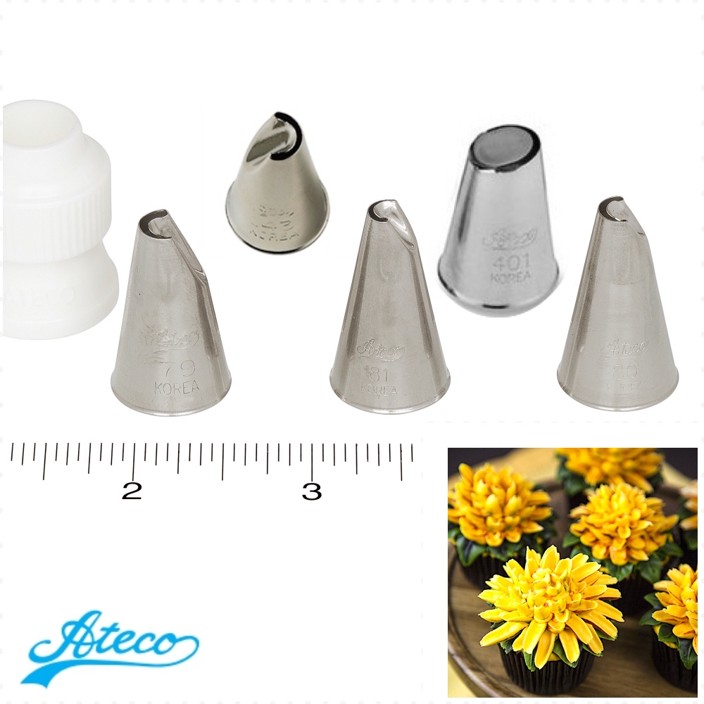 Кондитерские насадки Атеко №№ 79, 80, 81, 143 и 401, 403 - обычно используется как лепестки хризантемы, ромашки или герберы, а так же для отсаживания рюшей и бордюров.